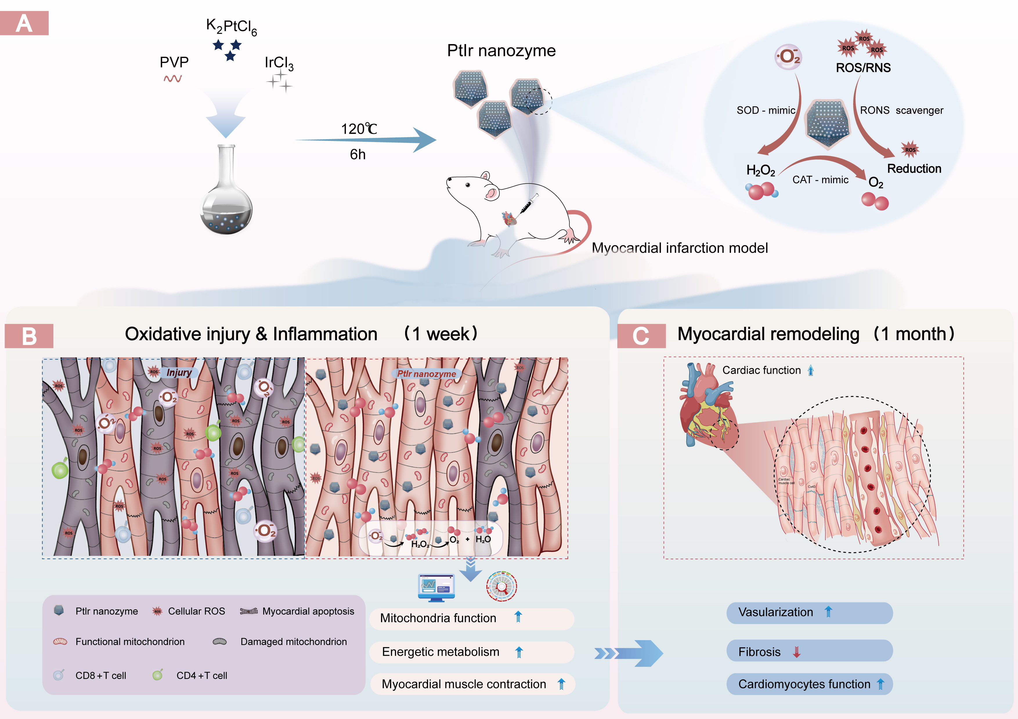 该研究开发了一种可用于心肌梗死病理微环境重塑的超小型PtIr双金属纳米酶,其通过模拟超氧化物歧化酶/过氧化氢酶双功能级联催化活性,有效中和过量活性氧(ROS),并可通过激活脂肪酸β-氧化、柠檬酸循环等通路增强线粒体代谢,协同调控炎症微环境实现心肌功能修复,为缺血性心脏病治疗提供新型纳米治疗策略。