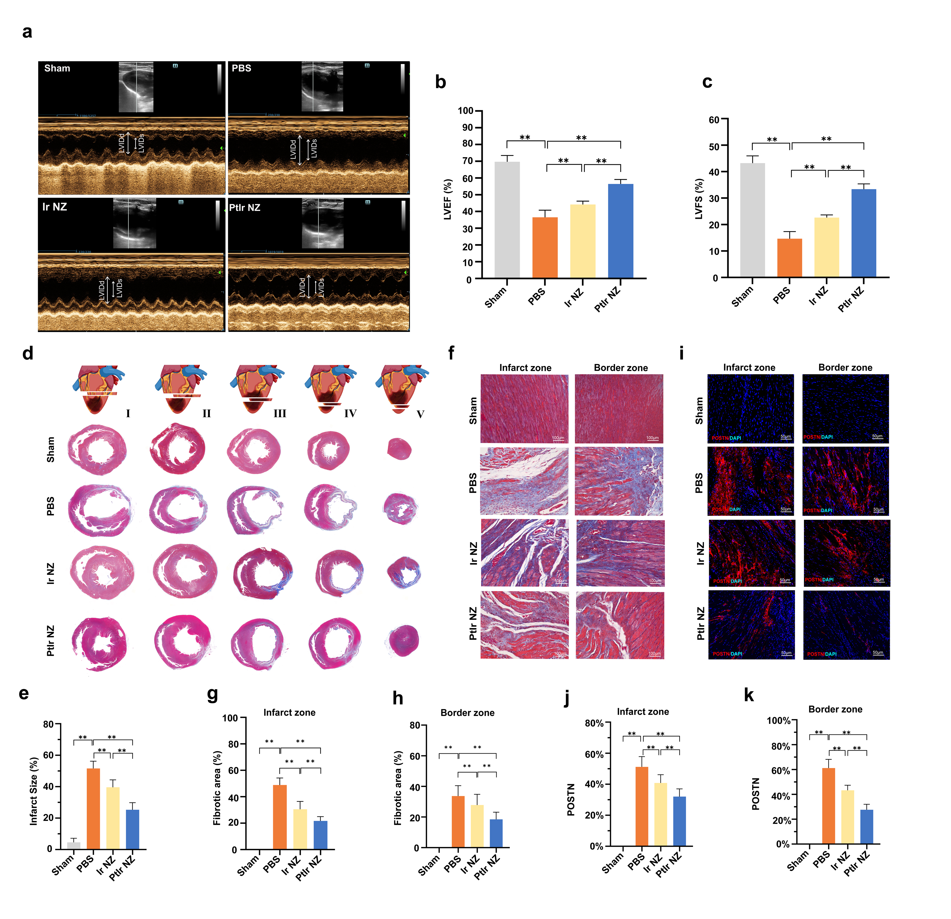 为了突破上述技术瓶颈,王海滨副教授课题组与国内同行合作,通过合理设计开发了一种可用于心梗治疗的超小型PtIr双金属纳米,该杂化双金属纳米酶具有多个活性位点协同增强的催化能力,相较于单金属体系展现出更优异的催化性能和更灵活的结构调控特性,在心梗微环境重塑中具有重要应用前景。