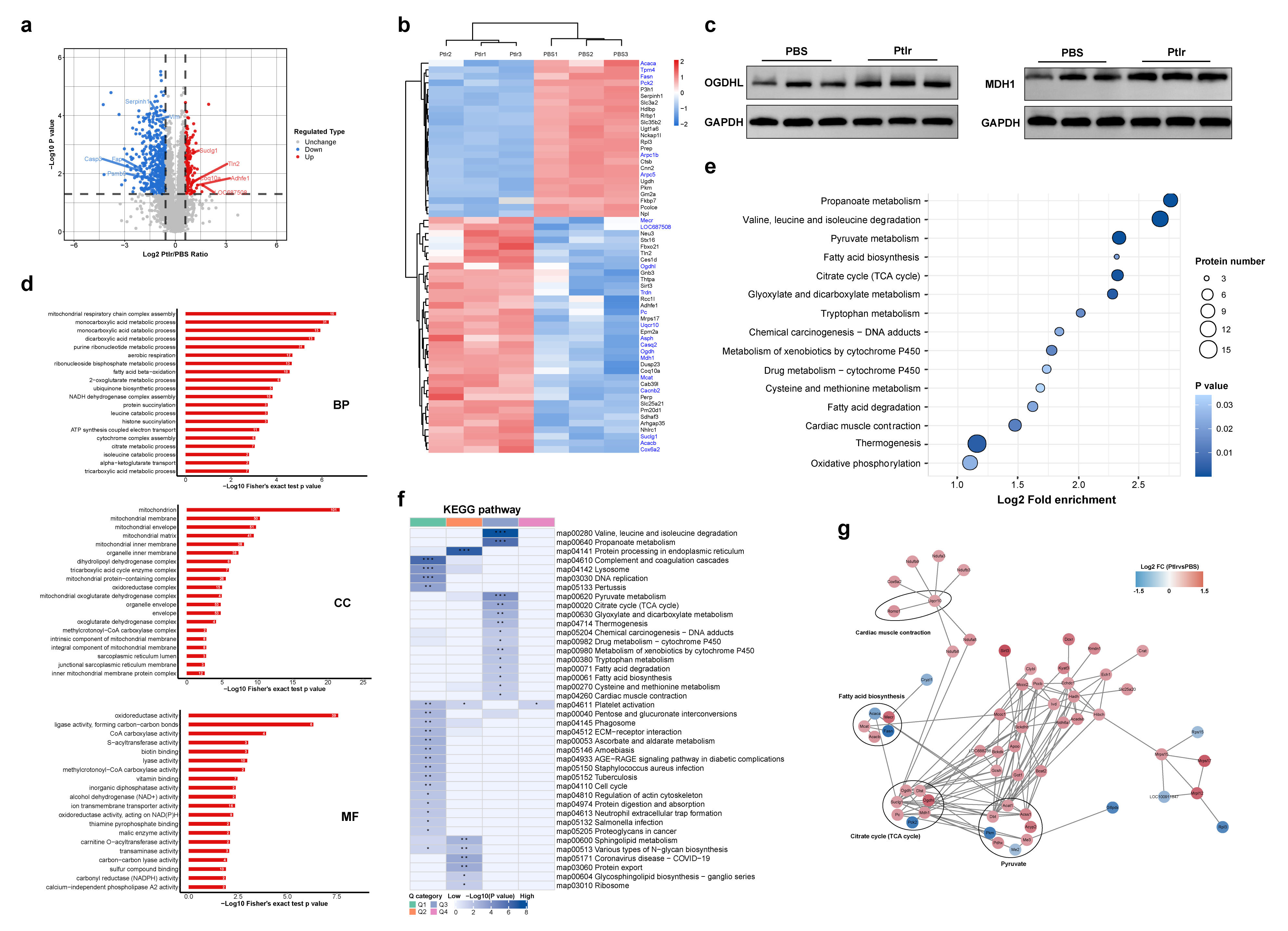 机制研究发现PtIr治疗可上调心脏能量代谢、线粒体功能及心肌收缩相关蛋白的表达,同时富集了脂肪酸β-氧化、柠檬酸循环等与线粒体功能和能量代谢相关的信号通路。