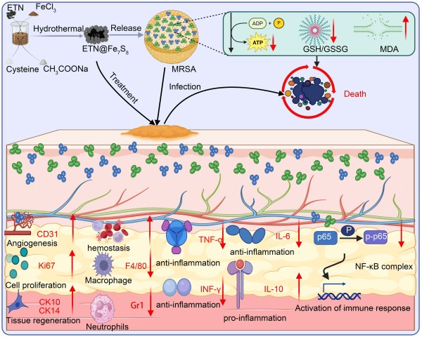 研究发现,该复合材料可在不依赖外部光源的条件下,通过释放Fe²⁺与多硫诱导铁死亡,强效杀灭耐甲氧西林金黄色葡萄球菌(MRSA);同时通过抑制NF-κB信号通路减轻炎症反应,并激活PI3K/AKT通路,促进血管新生与组织修复。在动物模型中,ETN@Fe₇S₈表现出优异的抗菌性、生物相容性与组织再生能力。本研究揭示了一种全新的多模式抗菌材料策略,从“抗菌—抗炎—修复”多维角度协同介入感染性创面的治疗过程,为多功能纳米材料在感染与组织再生领域的应用提供了理论基础与实践路径。