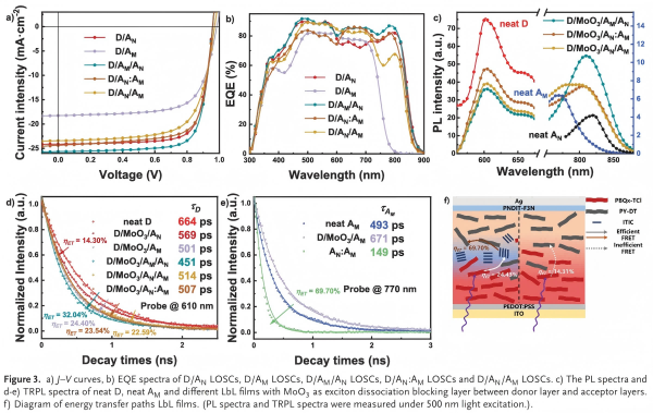 该研究成果于2025年5月6日以“Cascaded Energy and Charge Transfer Synergistically Prompting 18.7% Efficiency of Layered Organic Solar Cells with 1.48 eV Bandgap”为题,发表在Advanced Energy Materials上(DOI: 10.1002/aenm.202404718)。a片网站 张福俊教授为主通讯作者,博士研究生张路为第一作者。《Advanced Energy Materials》是国际能源材料领域最具影响力的顶级期刊之一,由全球知名学术出版机构 Wiley 发行,长期聚焦于能源材料与器件方向的前沿研究,该刊持续刊载具有原创性和引领性的高水平成果,在国际能源科学界具有广泛影响力。